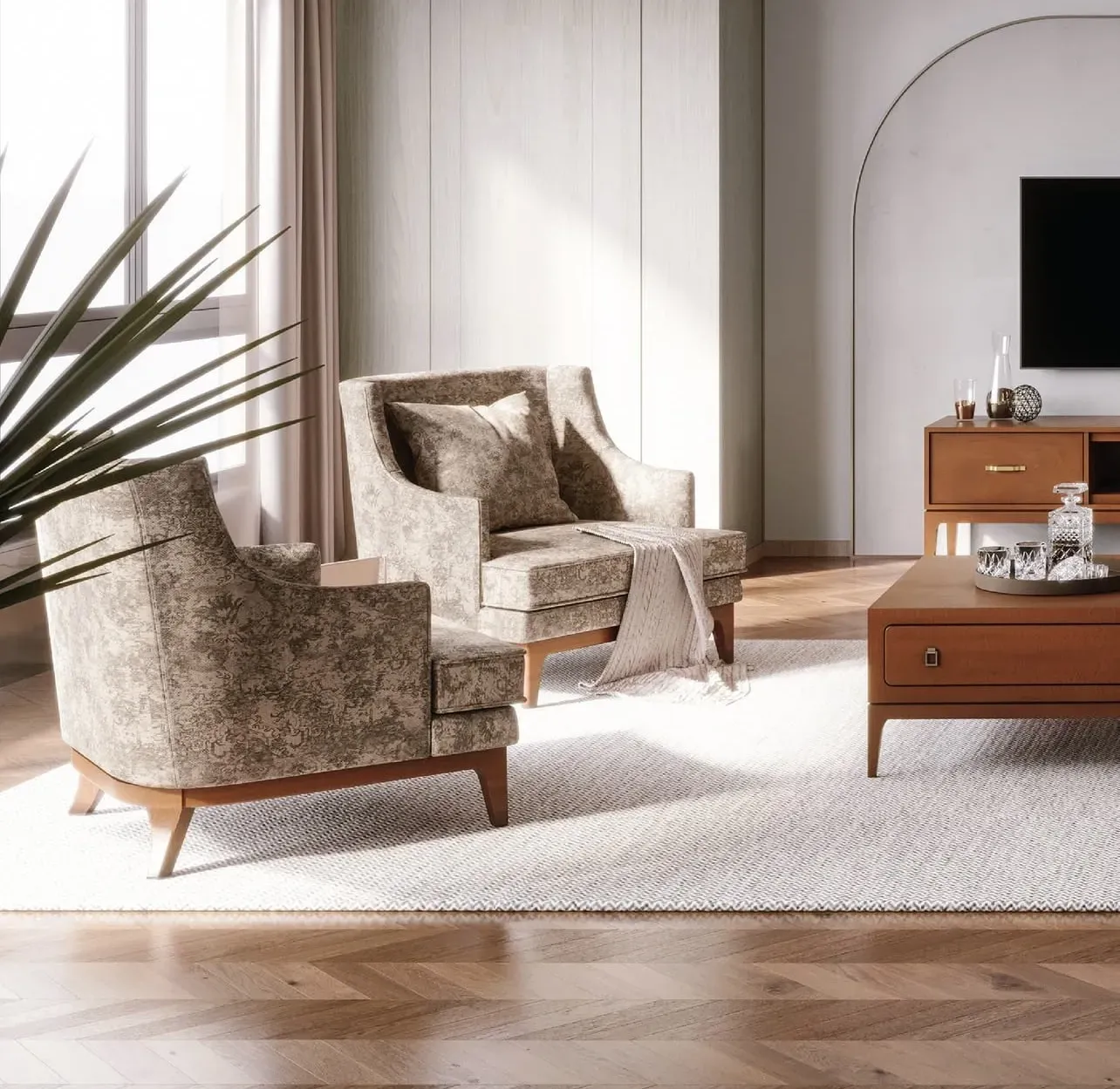 The Akome furniture set is a harmonious combination of modern design inspired by classic style. With its fully upholstered fabric cover and neat lines, it adds a balanced and calming appeal to your living space. The use of premium woods, a polyurethane finish, and high-quality upholstery fabrics, along with careful attention to ergonomic standards, makes this collection a lasting and practical choice for today’s homes. The technical features of this product include: