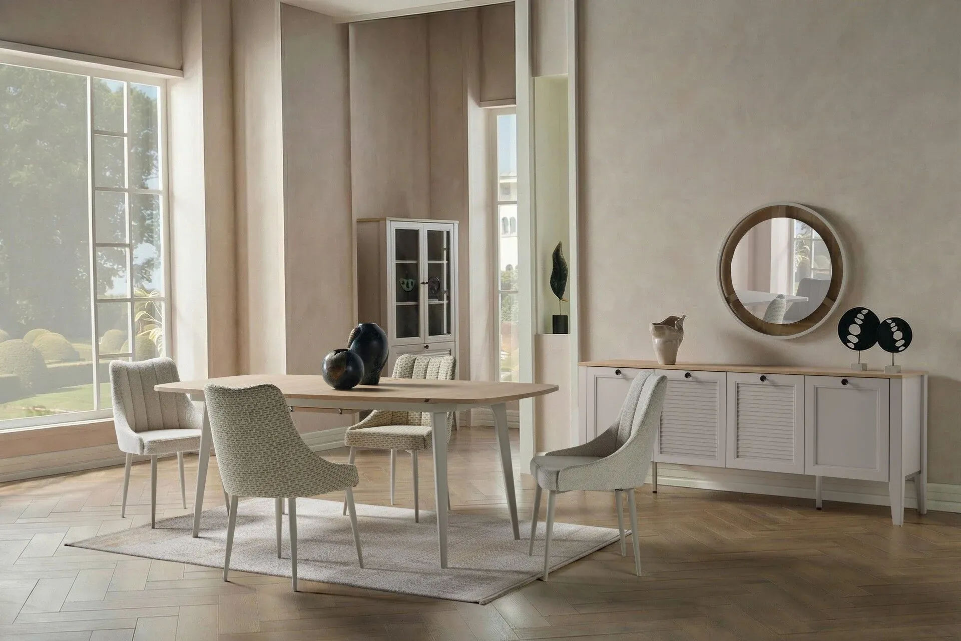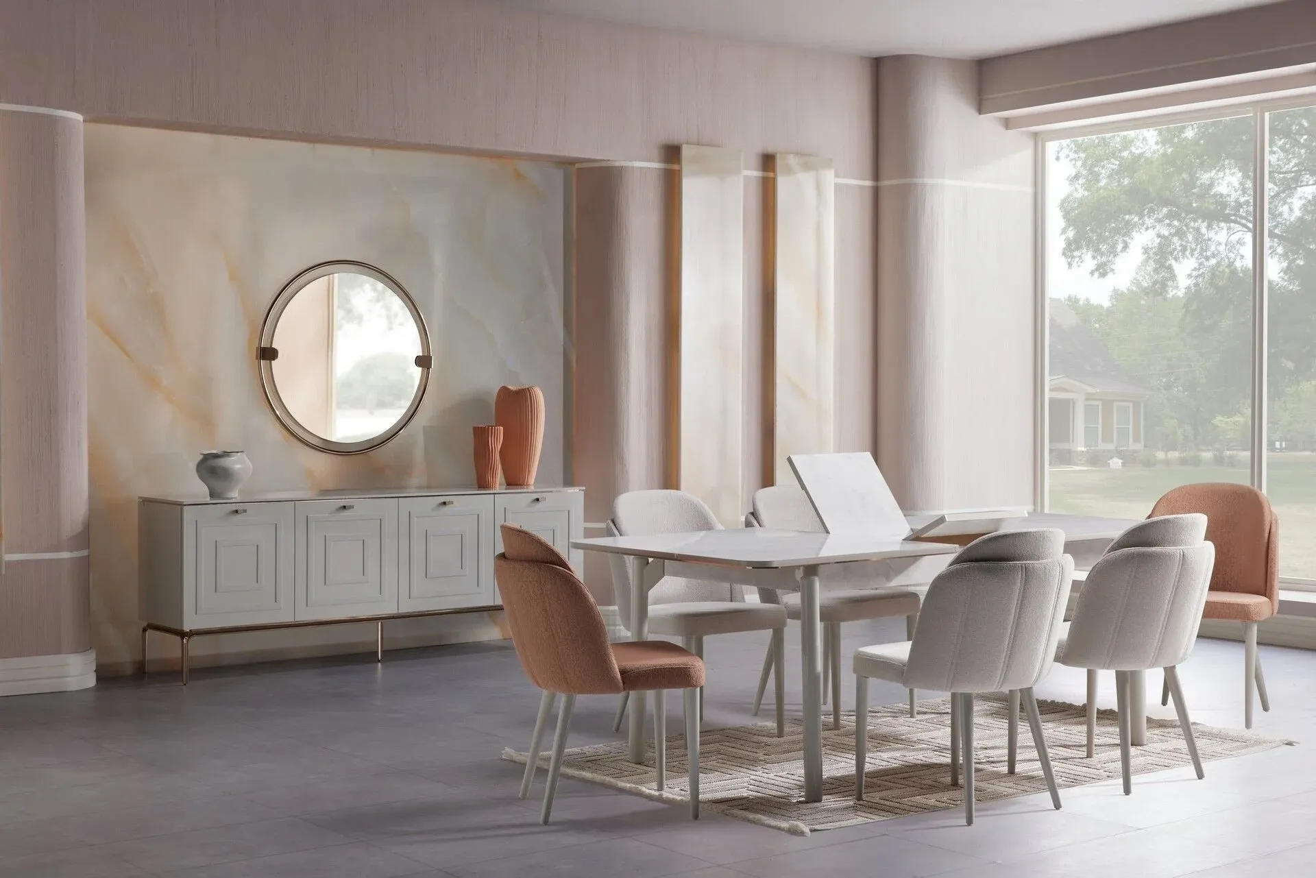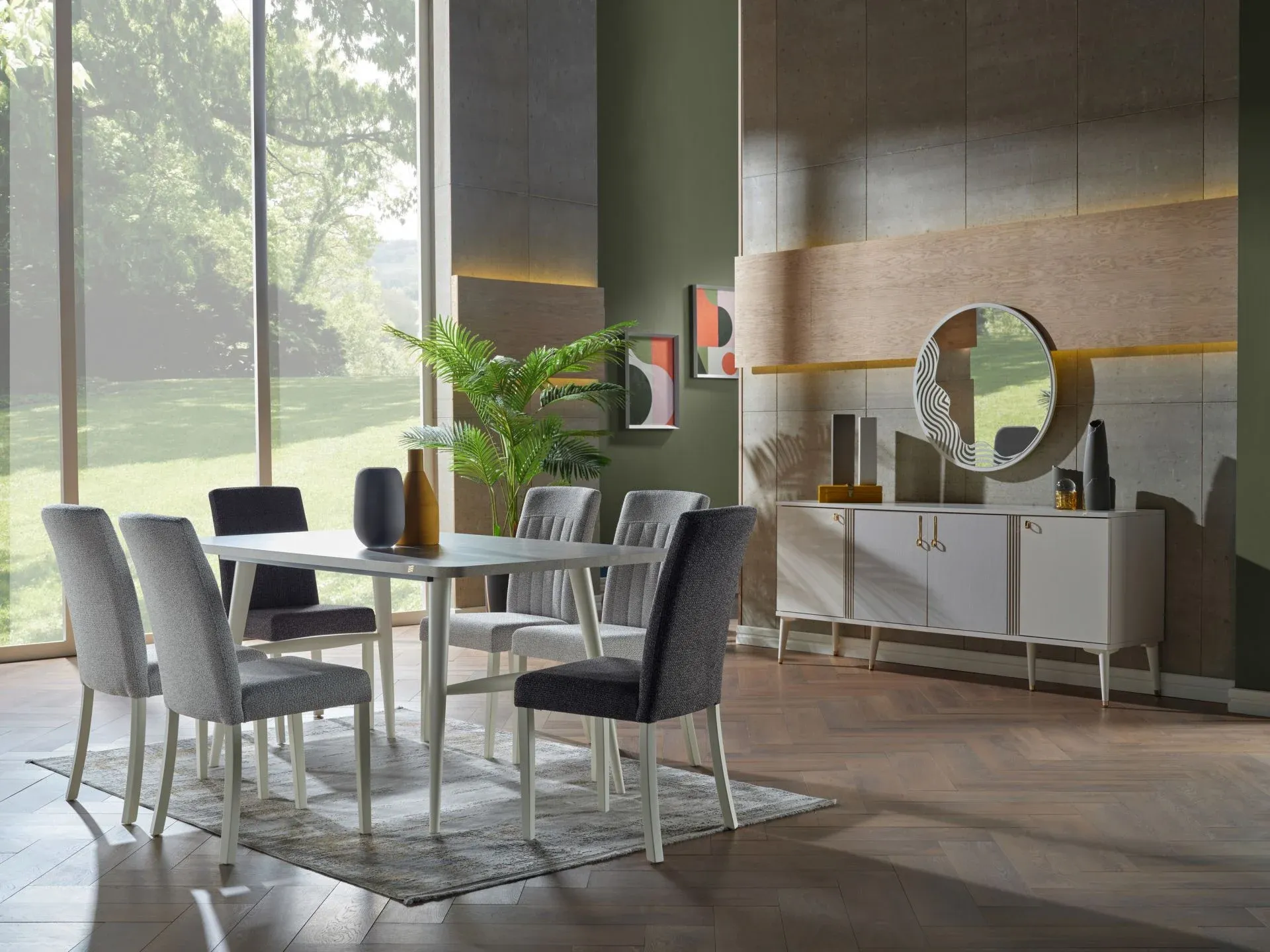 دیمەنی ڕووناکی ژووری نانخواردن بە مێزێکی گەورە و کورسییە ئاسوودەکانی بەهێز دەبێتەوە و دەرکەوتەیەکی بینراوی سەرنجڕاکێش دروست دەکات، هەروەها گۆشەی کەڤەرداری سەر کورسییەکانی ئەم مۆبیلیاتی تایبەت بە ژووری نانخواردنە، وا دەکات ئاسوودەیی ئەزموون بکەن. مێزی نانخواردن، وا دەکات لە ڕۆژێکی جەنجاڵدا ئەندامانی خێزان بە دەوری یەکتر کۆ ببنەوە و وەکوو شوێنێک بۆ پەیوەندی گرتنی کەسەکان و هاوبەشکردنی ئەزموونەکانی ڕۆژانەتان لێی بڕوانن. کۆمەڵێک دیزاینی هەمەچەشن بۆ ژووری نانخواردن بوونیان هەیە؛ کەشێک کە دەتوانن تێیدا لە ماندوویەتی و سترێسی ڕۆژانەتان ڕزگار ببن.