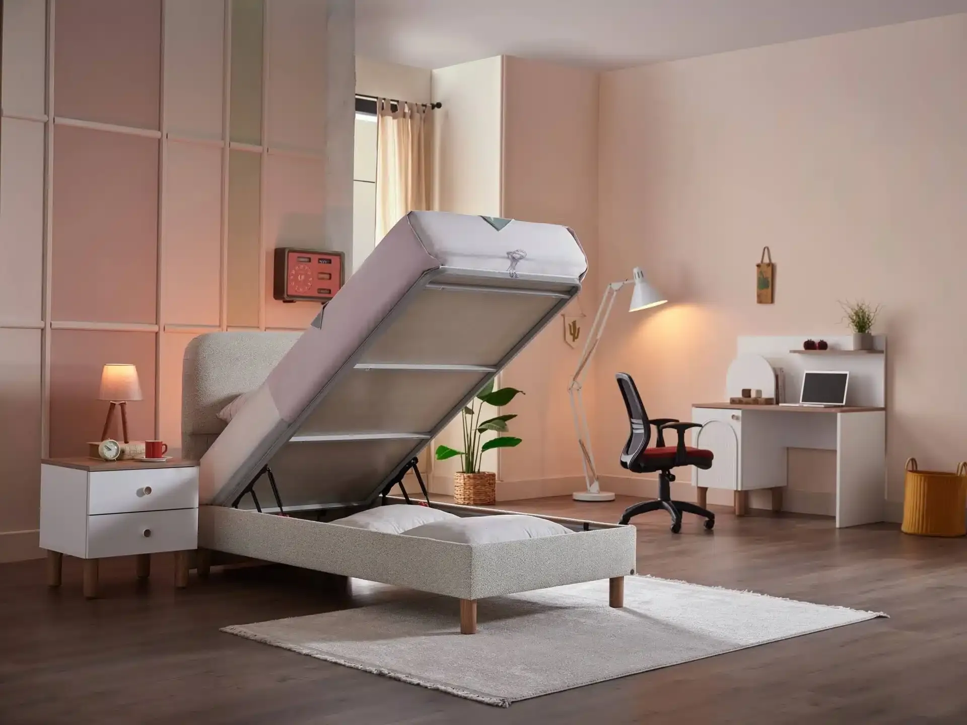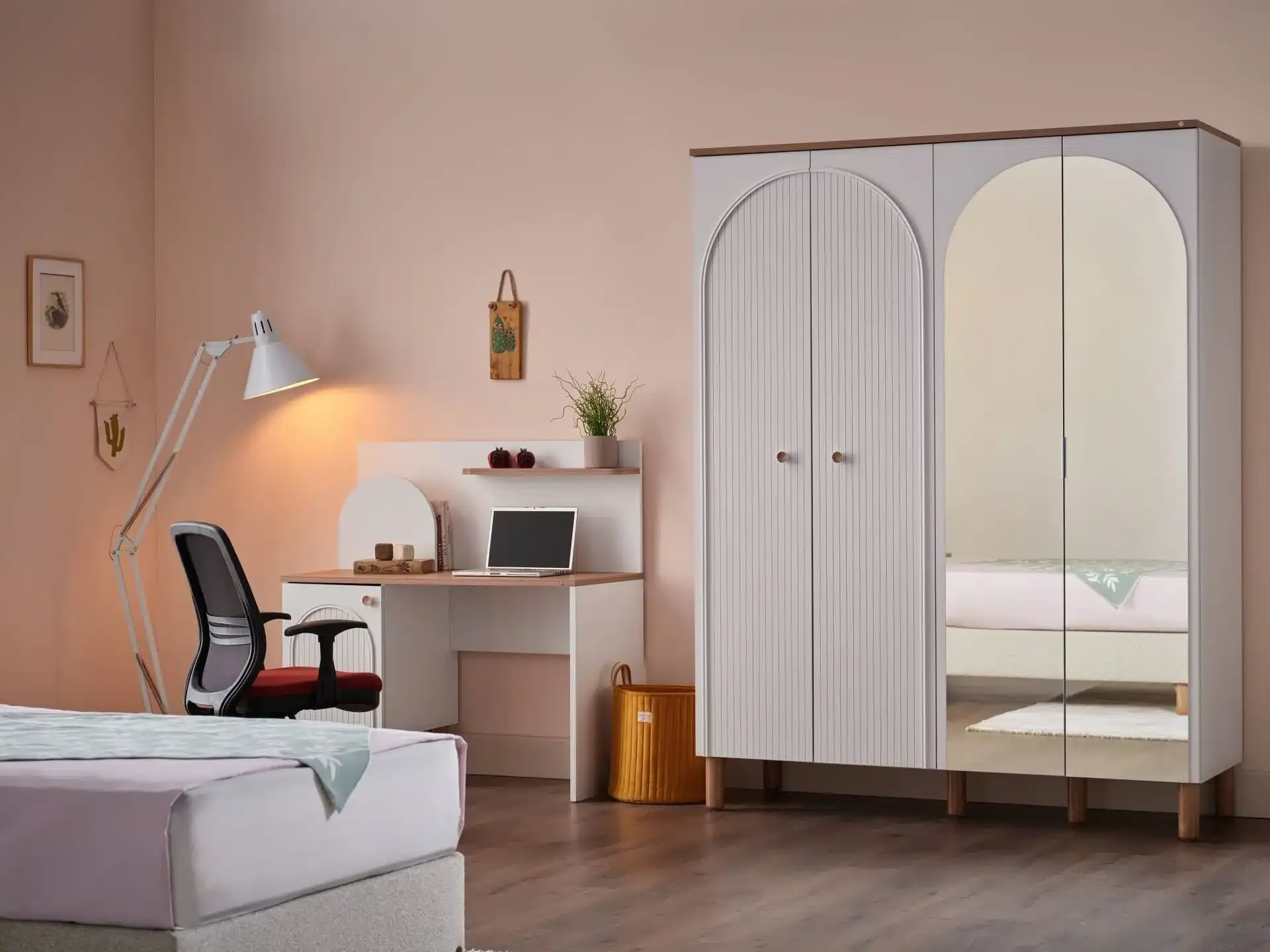 ئەم سێتە بە تێکەڵکردنی هۆشمەندانەی پێکهاتە سروشتییەکان، پالیتی ڕەنگی بێلایەن و وردەکاریی دیکۆراتی کاری دەست، کەشێکی نافەرمی و دڵنشین دەئافرێنێت. لە هەمان کاتدا، دیزاینی پراکتیکی ئەم سێتە پێداویستییەکانی ژوورێکی نووستنی تازەلاوان کە بریتییە لە شوینی خوێندنەوە و کۆگاکردنی پێویست بە شێوەیەکی باش دابین دەکات.