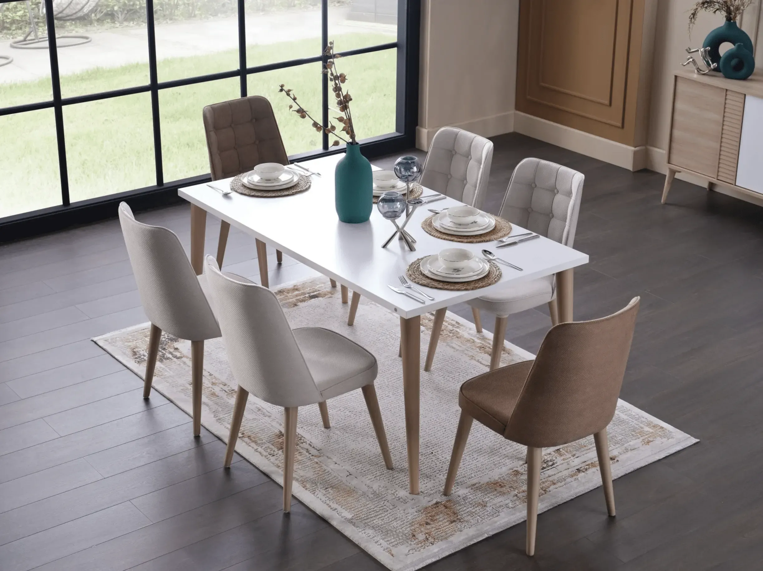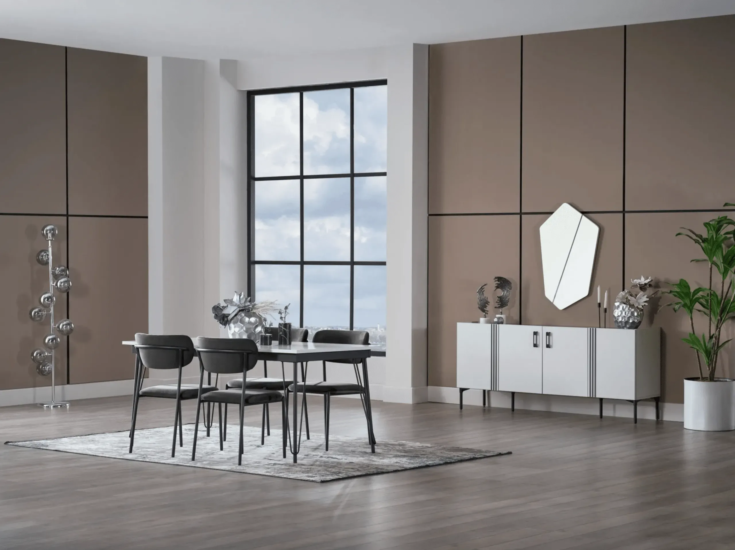 سێتەکانی نانخواردنی کۆمەڵەی مۆندی هۆم بە دیزاینێکی مۆدێرن و هێڵی پاک و ستراکچەرێکی بەهێز کە لە دار و کانزای بەرگەگر دروست کراوە، تێکەڵەیەک لە جوانی و کارایی پێشکەش دەکەن. ڕووکاری دژە کڕان و دژە پەڵەیان وا دەکات پاککردنەوە و پاراستنی دیمەنێکی نوێیان ئاسان بێت. کورسییەکان بە ڕەچاوکردنی ئەرگونۆمی ئاسوودەیی درێژخایەن مسۆگەر دەکەن، هەروەها جۆراوجۆری ڕەنگ و ڕەهەندەکانیان وایان لێدەکات بۆ هەر جۆرە دیکۆراتێکی ناوەوە گونجاو بن.