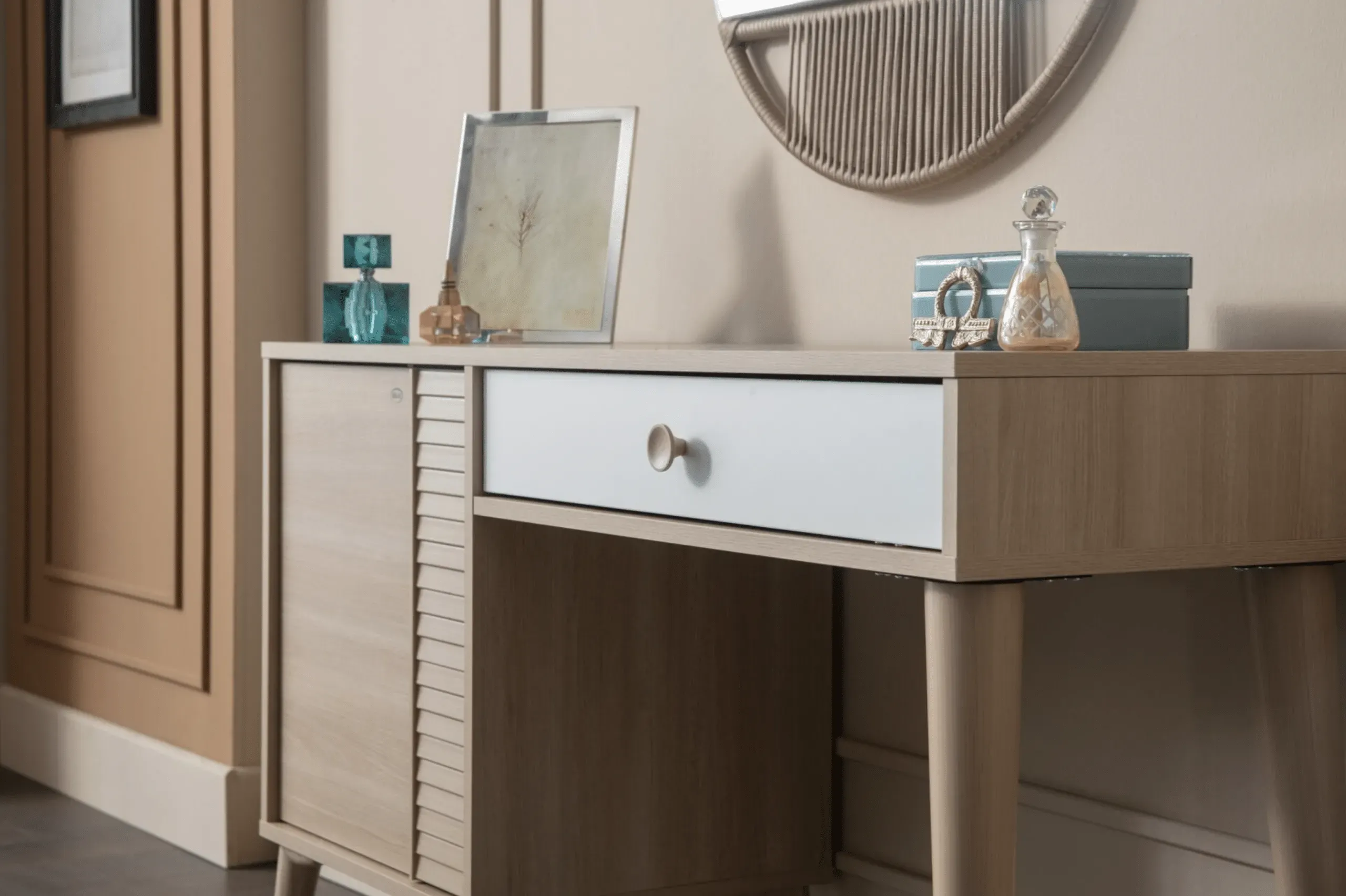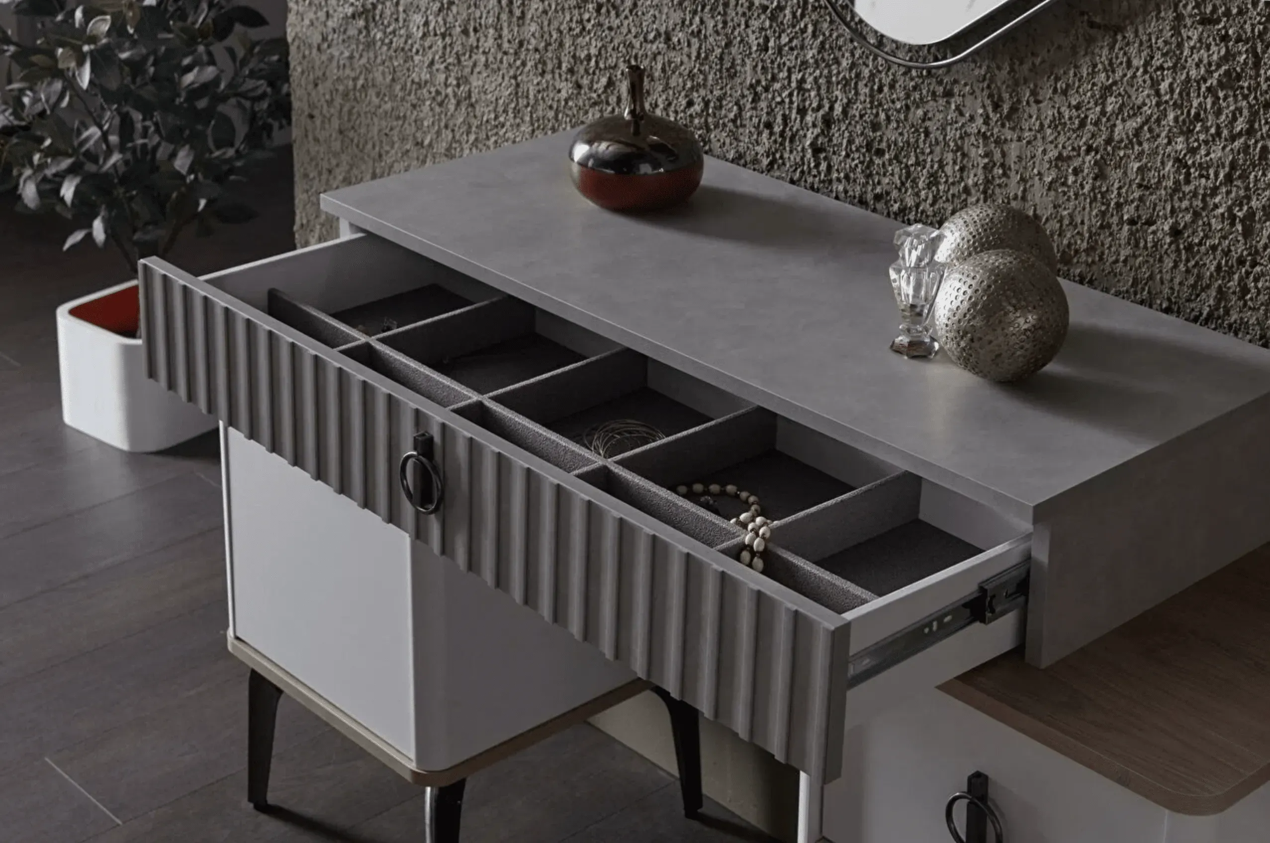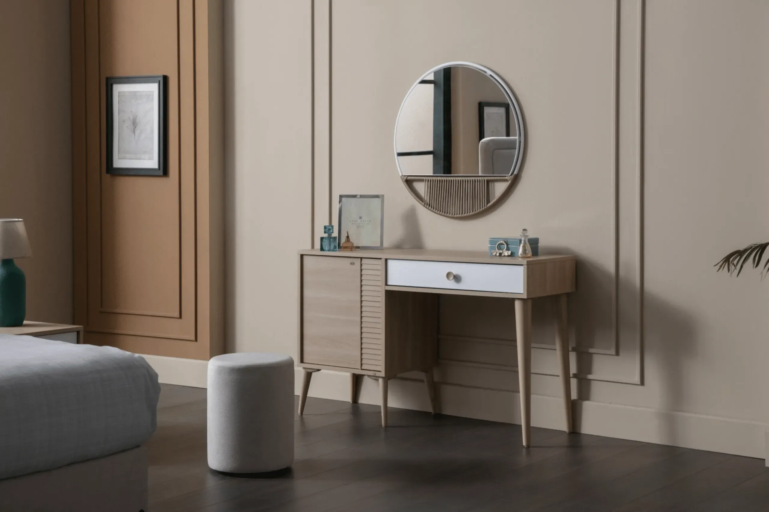 مێزی ئارایش لەم کۆمەڵەیەدا، بە دیزاینە مۆدێرنەکانیان و هێڵە ناسکەکانیان، شوێنێکی ڕێک و پێک و خۆش بۆ ڕۆتینی ڕۆژانەت دروست دەکەن. ستراکچەری بەهێز و کەرەستەی کوالیتی بەرز مانەوە و کارایی متمانەپێکراو مسۆگەر دەکات. چەکمەجەی فراوانەکان و ڕووی پراکتیکی وا دەکات ڕێکخستنی ماکیاژ و ئیکسسواراتەکانت ئاسان بێت، پاککردنەوەی مێزەکە ئاسان بێت دیمەنی ڕێکوپێک و شیکی مێزەکە بپارێزێت. جۆراوجۆری ڕەنگ و ڕەهەند و شێوازی دیزاین وا دەکات کە هەماهەنگی لەگەڵ چەندین دیکۆراتی ناوەوەدا ئاسان بێت.