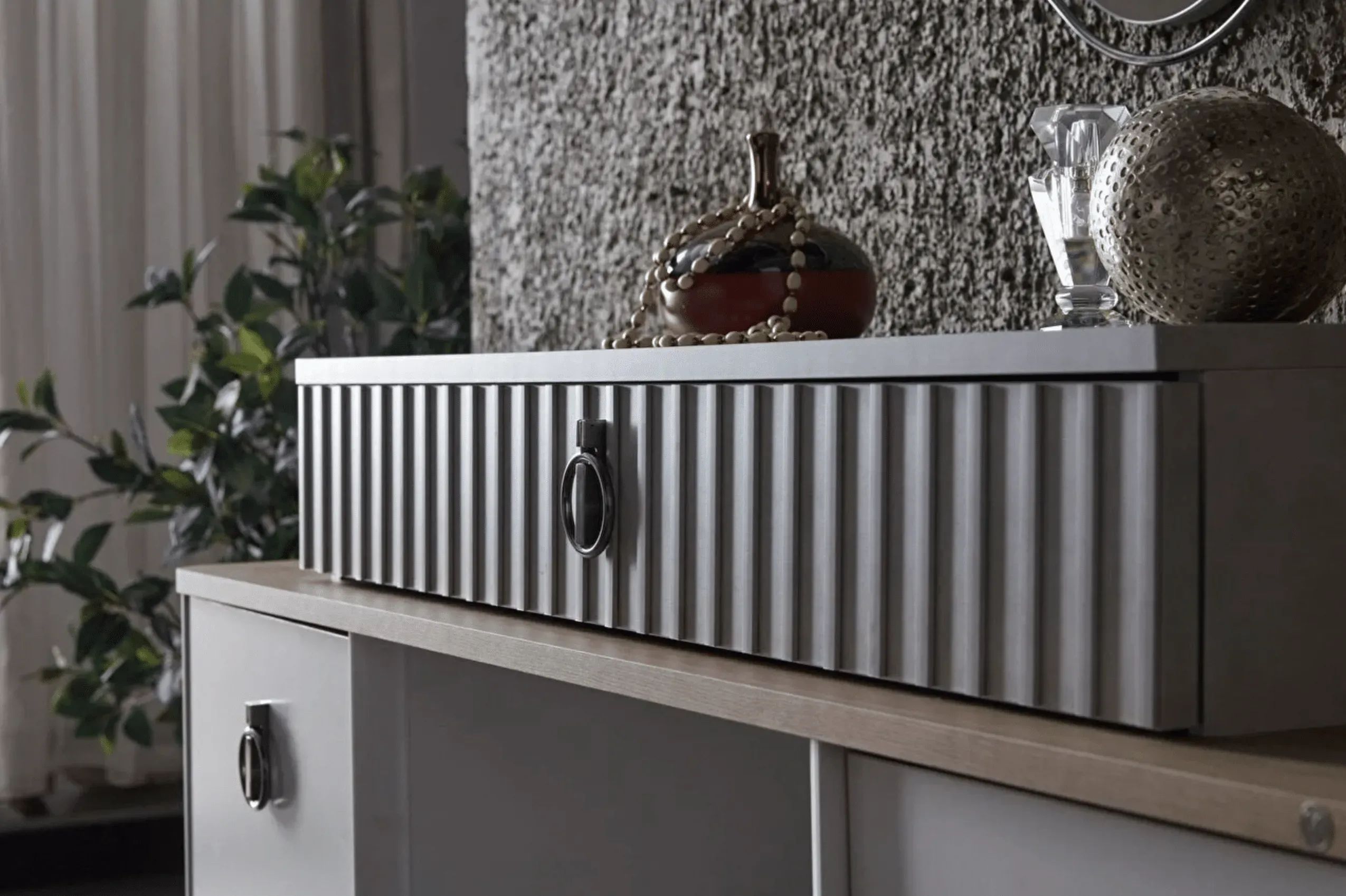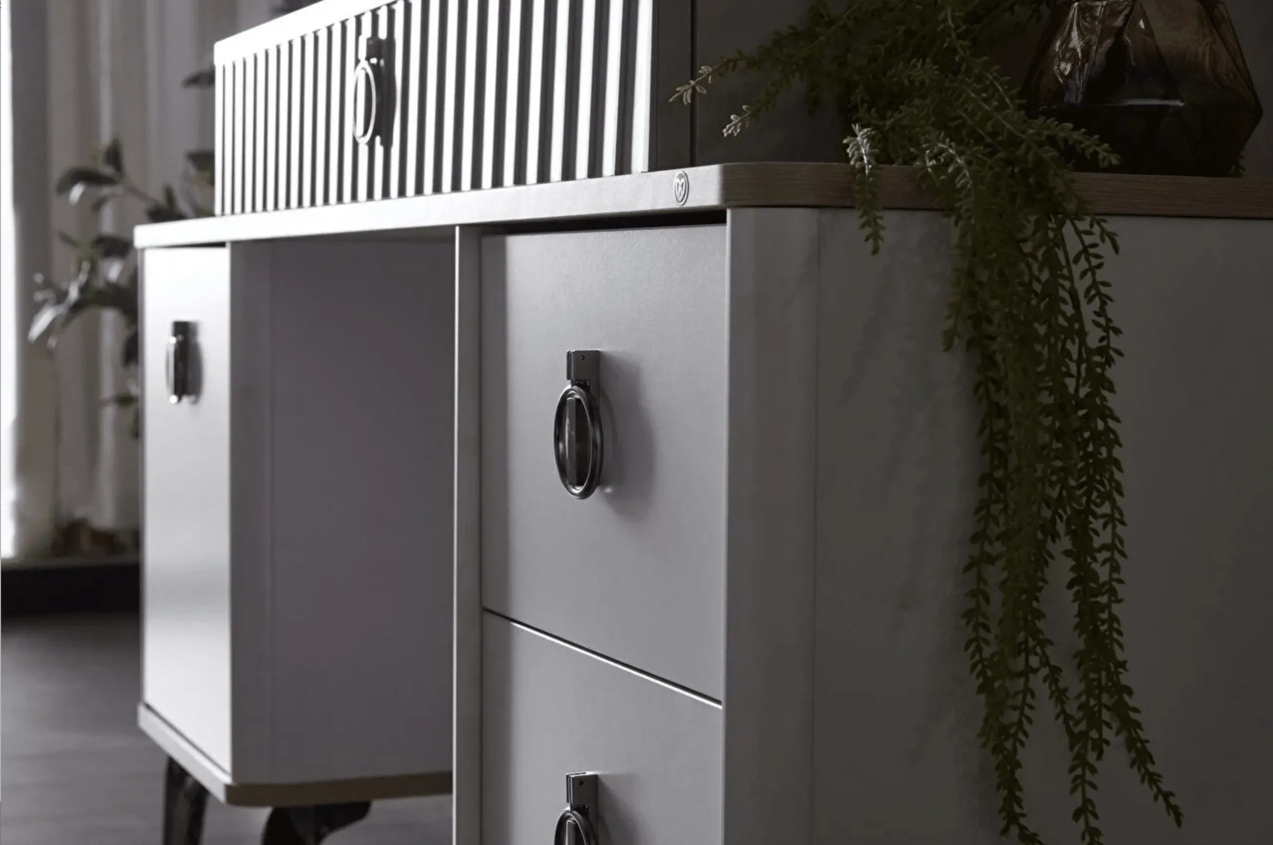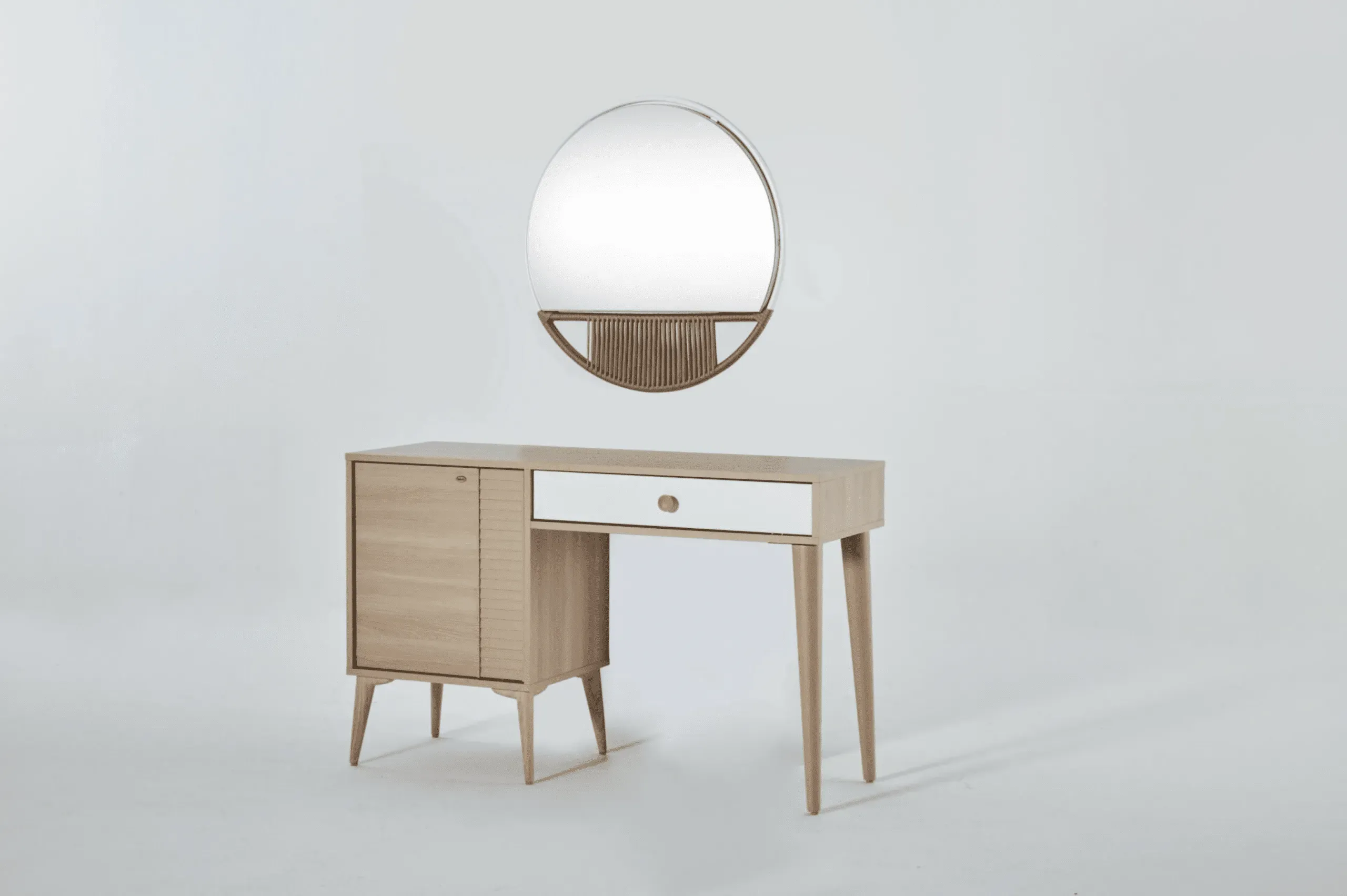 مێزی ئارایش لەم کۆمەڵەیەدا، بە دیزاینە مۆدێرنەکانیان و هێڵە ناسکەکانیان، شوێنێکی ڕێک و پێک و خۆش بۆ ڕۆتینی ڕۆژانەت دروست دەکەن. ستراکچەری بەهێز و کەرەستەی کوالیتی بەرز مانەوە و کارایی متمانەپێکراو مسۆگەر دەکات. چەکمەجەی فراوانەکان و ڕووی پراکتیکی وا دەکات ڕێکخستنی ماکیاژ و ئیکسسواراتەکانت ئاسان بێت، پاککردنەوەی مێزەکە ئاسان بێت دیمەنی ڕێکوپێک و شیکی مێزەکە بپارێزێت. جۆراوجۆری ڕەنگ و ڕەهەند و شێوازی دیزاین وا دەکات کە هەماهەنگی لەگەڵ چەندین دیکۆراتی ناوەوەدا ئاسان بێت.