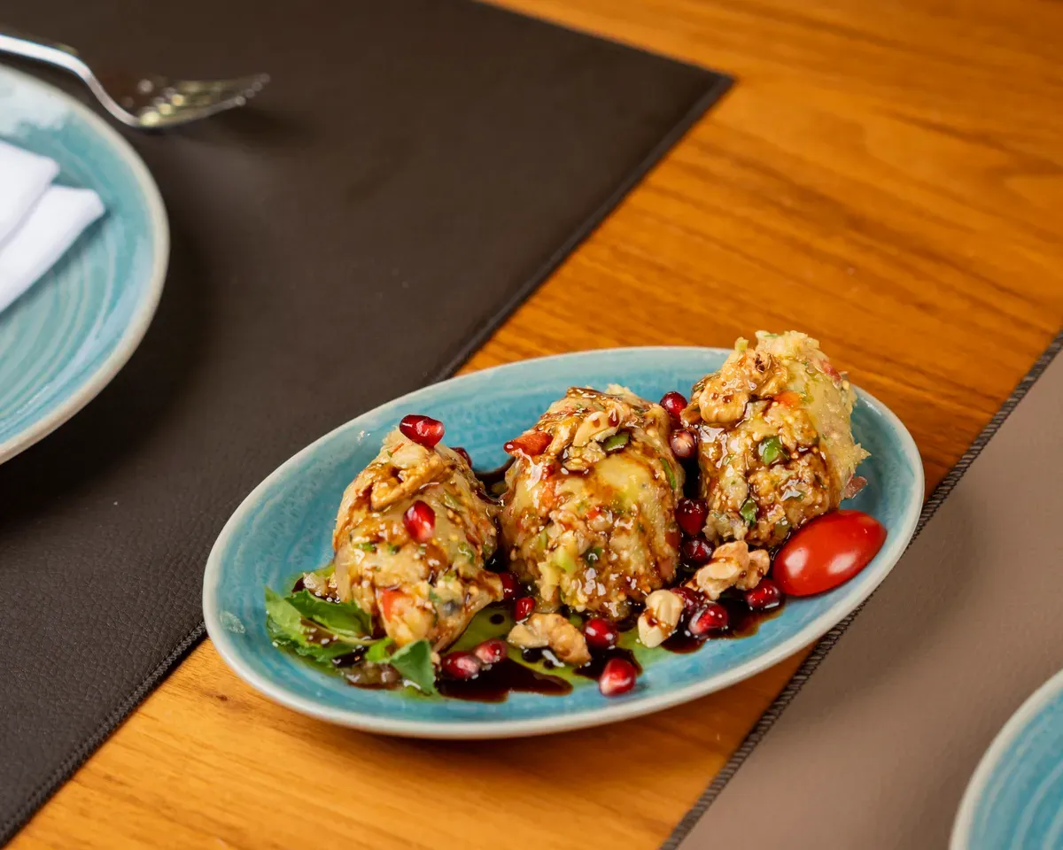 پێکهاتەکان: کەبەی سورکراوەی قووڵ پڕکراوە لە گۆشتی وردکراو و گوێزی کوڵاو
