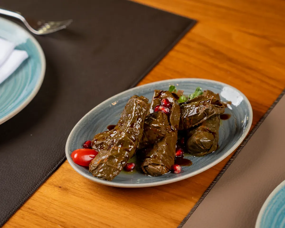پێکهاتەکان: گەڵاکانی ترێی ڕۆڵکراو پڕکراوە لە برنج، بەهارات کراوە بە لیمۆ و زەیتی زەیتون