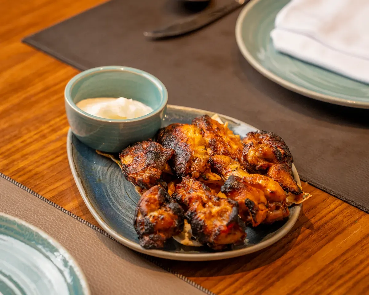 پێکهاتەکان: باڵە مارینیتەکان لەسەر خەڵوز کبابی دەکرێت، لەگەڵ دیپی سیر پێشکەش دەکرێت