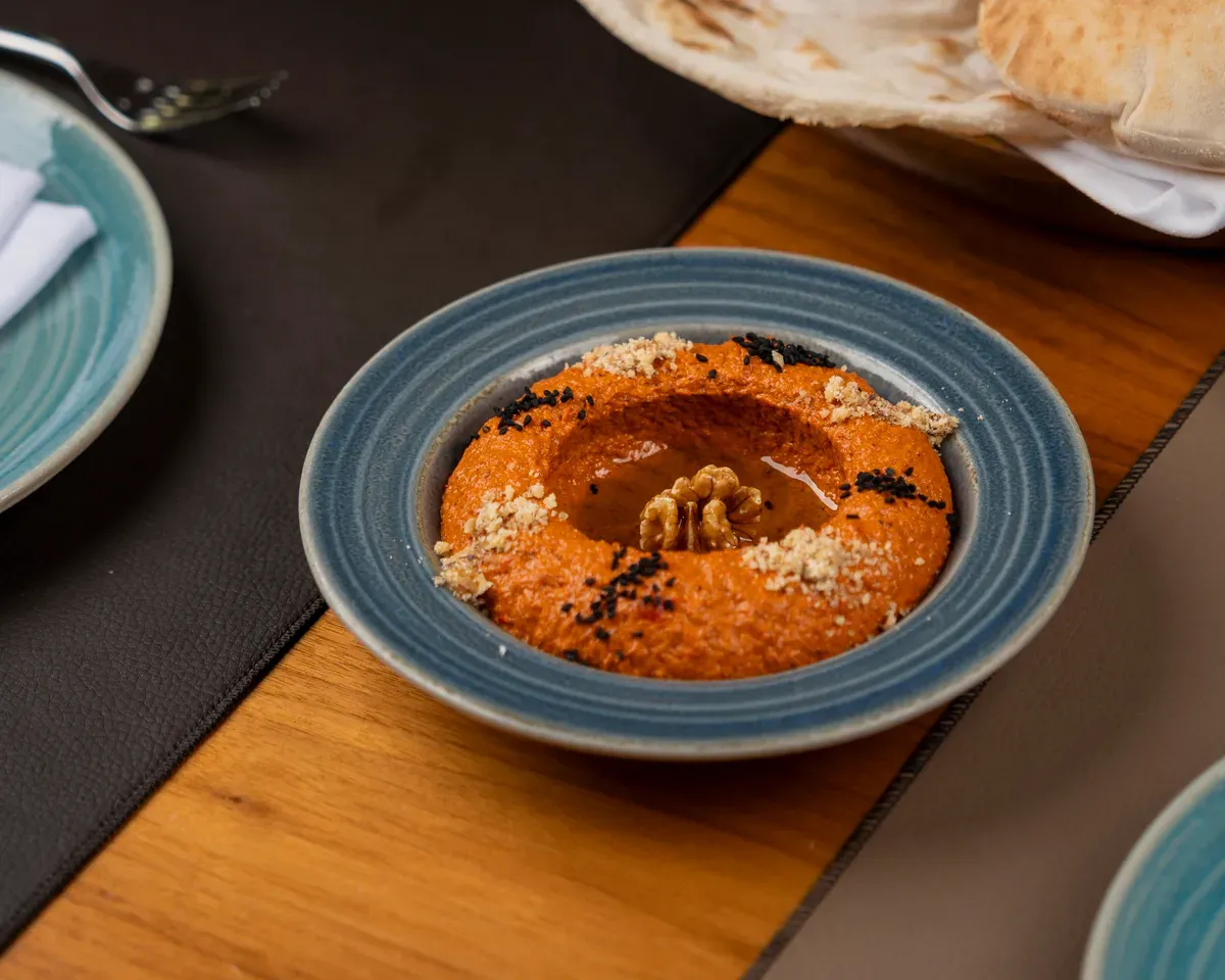 پێکهاتەکانی: بیبەری سوور و سەوز و گوێز و تاهینی تێکەڵاو لەگەڵ زەیتی زەیتون