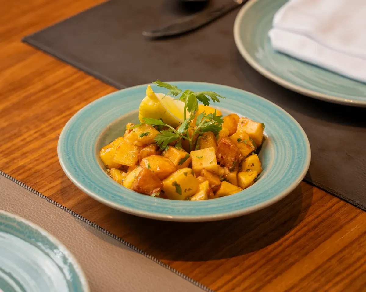 پێکهاتەکان: پەتاتەی کوبی سورکراوە کە بە بەهارات و زەیتی زەیتون و زەیتی زەیتون سووتاوە