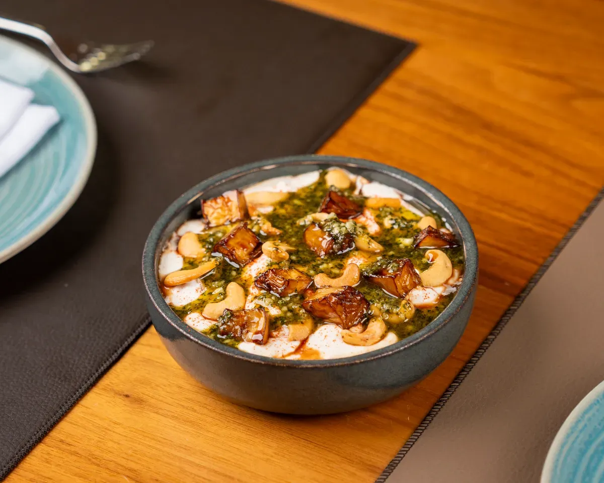 پێکهاتەکان: پارچەی باینجان کە لەسەر جێگایەکی نانی برژاو، تێکەڵەی ماست، سیر، سورکراوە، ڕازاوە بە باینجانی کارامێل، کاجوی برژاو، چەتنی نەعنا، پاپریکا