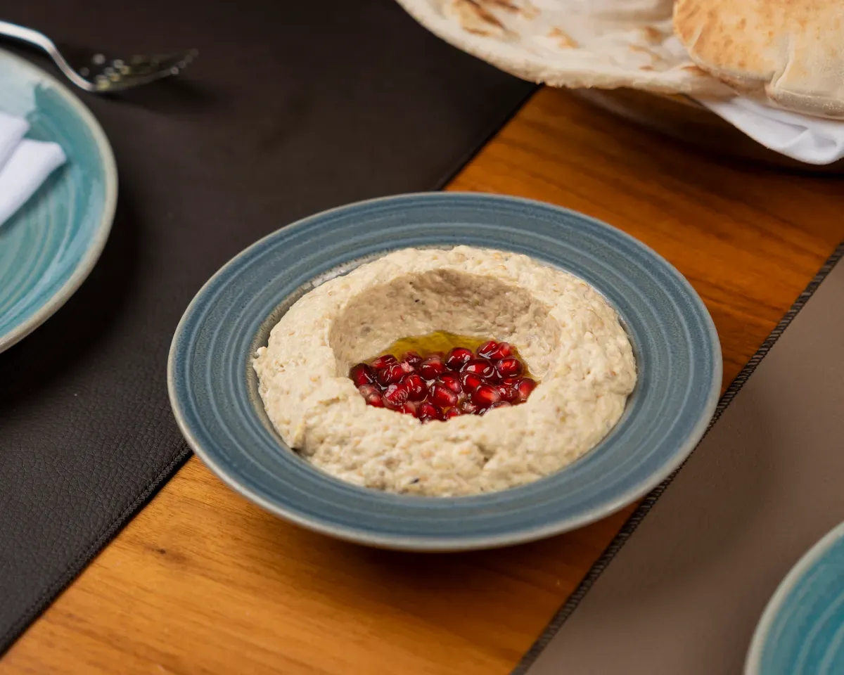 پێکهاتەکان: تێکەڵەیەک لە پورەی پاقلەی کبابی لەگەڵ لیمۆ و سیر و هەویرەی تاهینی، زەیتی زەیتون، بە هەنار ڕازاوەتەوە