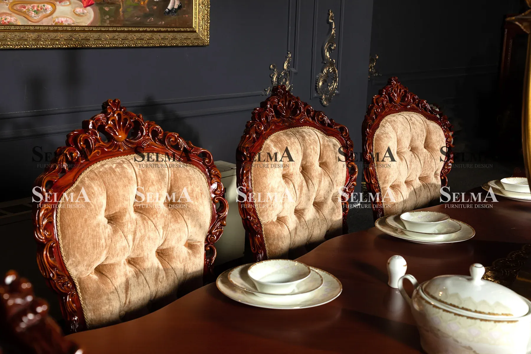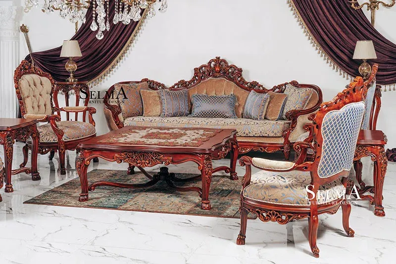 تاقم قەنەفە و کورسی مێزی نانخواردنی ئەرەس بە ئیلهام لە ستایلە بەشکۆکانی بارۆک و ڕۆکۆکۆ، دیمەنێکی ڕەسەن و شاهانە بە کەشە فەرمییەکان دەبەخشێت. نەخشاندنی کاری دەست، وردەکاریی هونەرمەندانە و کوالیتیی دروستکردنی ناوازە، ئەم کۆمەڵە کینکسایزە دەکات بە بژاردەیەکی لوکس و هەرمان بۆ دیکۆراتی کلاسیک و نیوکلاسیک.