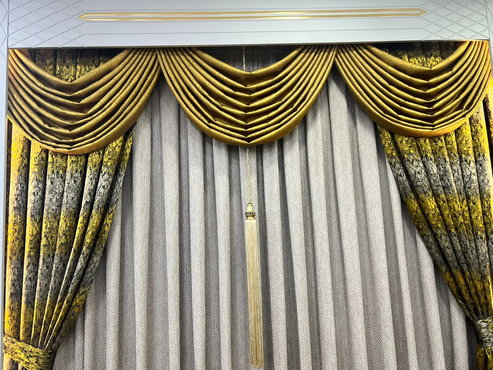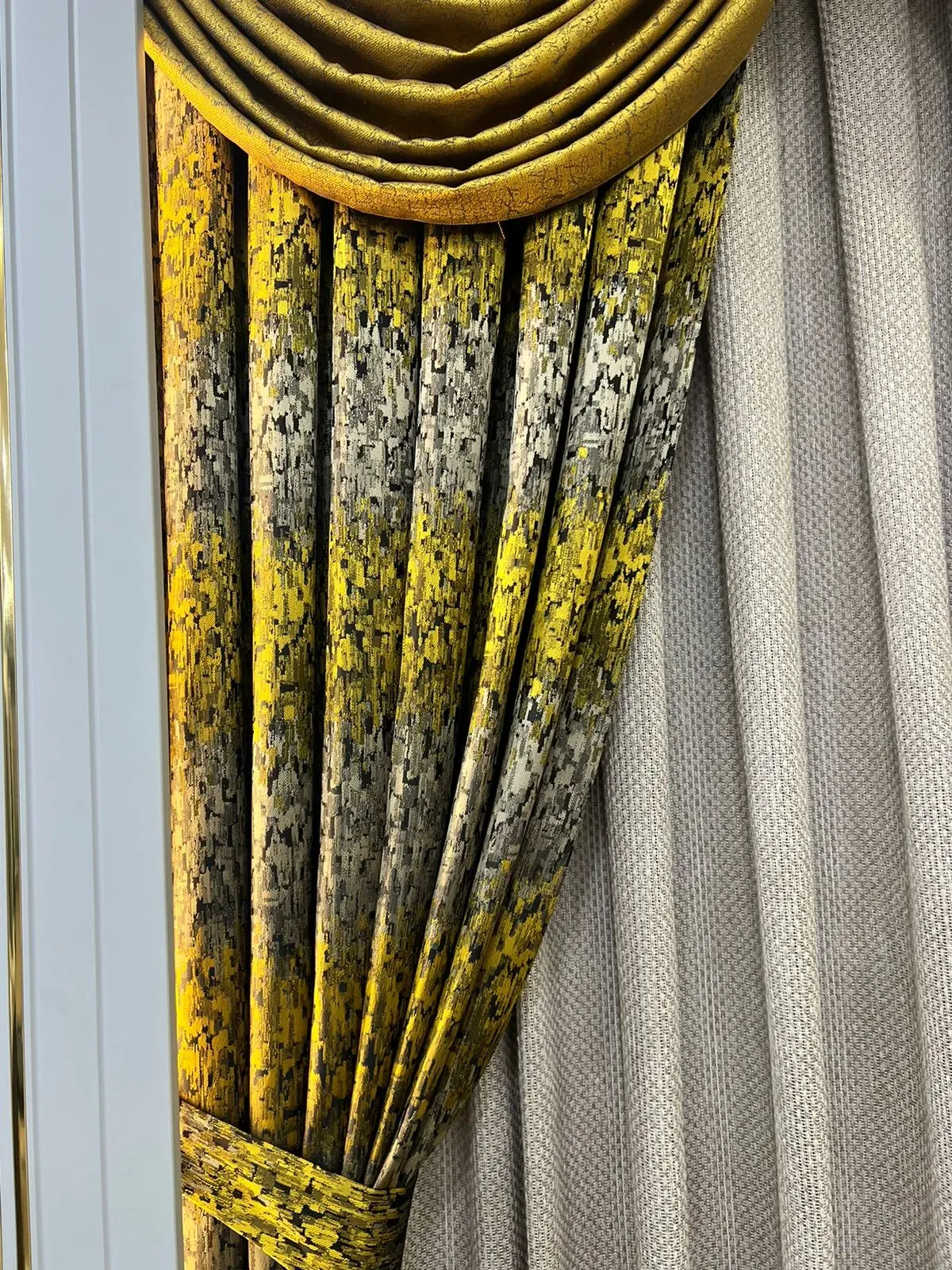 Bu perde tasarımı, kabartmalı desenleri ve dokuları resmi ve klasik bir dökümle birleştirerek modern ve görkemli bir stil sergiliyor. Lüks konut alanlarında odak noktası olacak şekilde tasarlanmıştır.