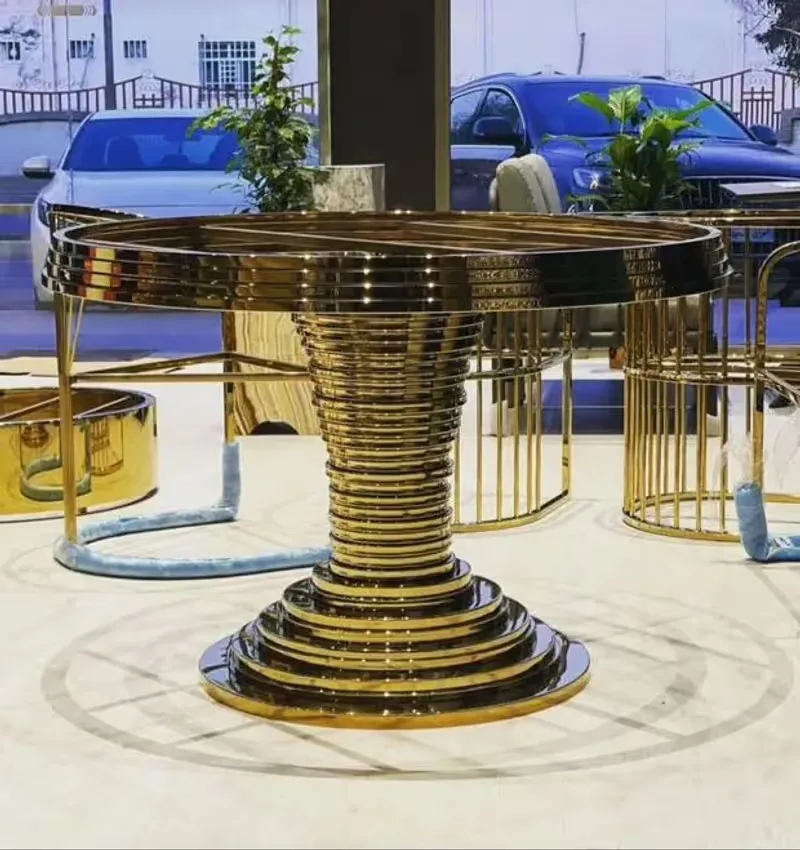 Parlak altın ayaklara sahip ayna sehpamız yüksek kaliteli ve dayanıklı malzemeler kullanılarak üretilmektedir. 304 paslanmaz çelik ile birlikte titanyum kaplama kullanımı yalnızca dayanıklılığı artırmakla kalmaz, aynı zamanda zarif ve kalıcı bir görünüm oluşturur ve tasarım ile ölçülerin müşterinin tercihlerine göre özelleştirilmesine olanak tanır.