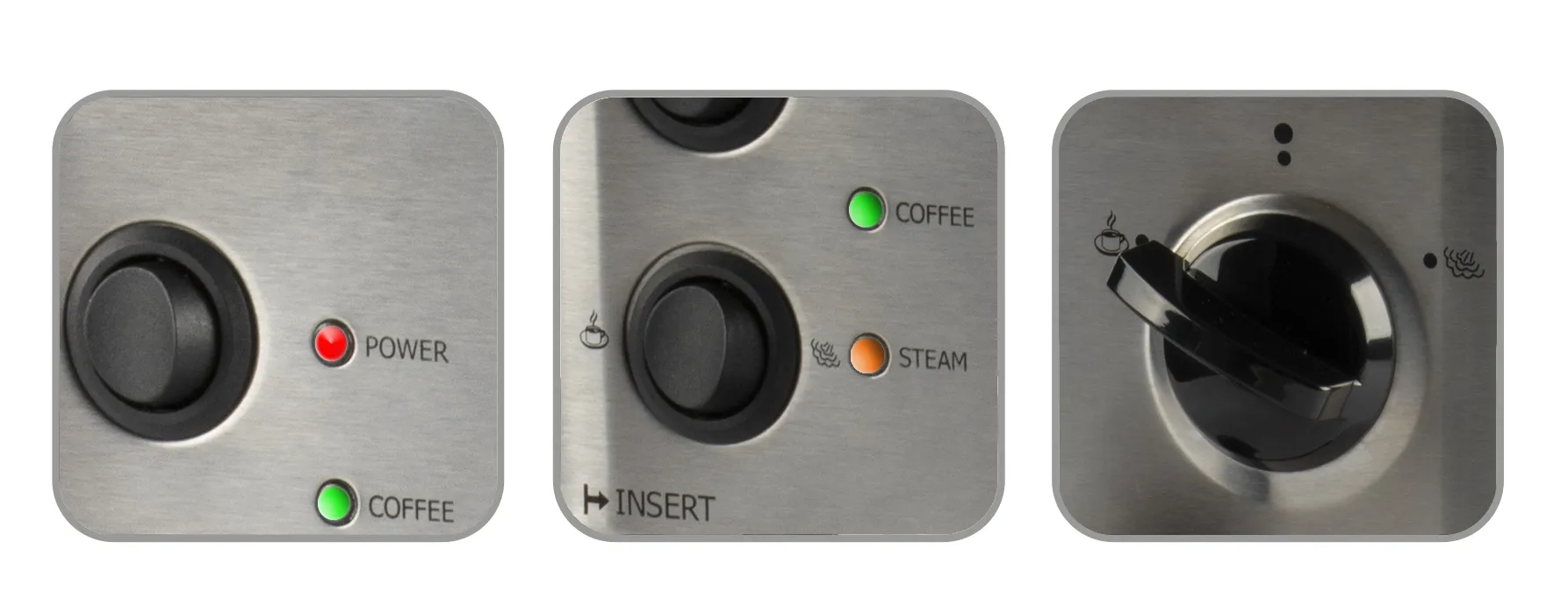 NS-529 意式咖啡机配备三枚操作简便的按钮。第一个按钮用于开关机。设备开启时,红色指示灯亮起,数分钟后咖啡指示灯变为绿色,表示水已开始沸腾。当水准备好可制作浓缩咖啡时,橙色指示灯亮起,提示可进行咖啡萃取。